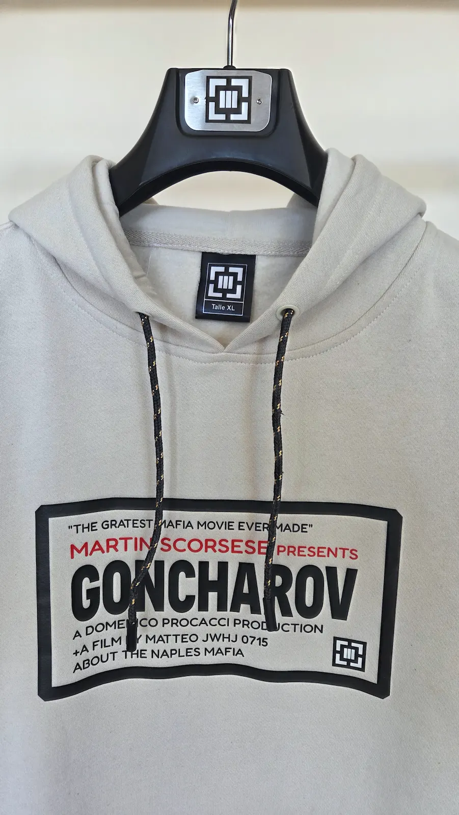 El hoodie Goncharov rinde homenaje a la película más grande jamás filmada… y que en realidad nunca se filmó. Basado en el fenómeno online que convirtió a Goncharov (1973) en un clásico inexistente de Martin Scorsese, este diseño replica la estética de un afiche retro con tipografía de época. Corte cómodo, algodón suave y una ironía de culto: ideal para cinéfilos que aman los inside jokes tanto como las obras maestras reales.