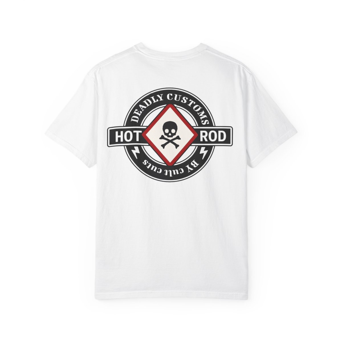 La T-Shirt Hot Rod es el estandarte de la línea Deadly Customs. El diseño en la espalda combina una calavera enmarcada en rombo rojo —símbolo universal de advertencia— con la tipografía contundente de Hot Rod. Inspirada en la estética de los clubes biker y la cultura del taller, transmite la crudeza de la carretera y la adrenalina de la velocidad. Disponible en blanco y negro, confeccionada en algodón premium y con corte clásico. Una pieza para quienes viven con olor a gasolina y libertad en el aire.