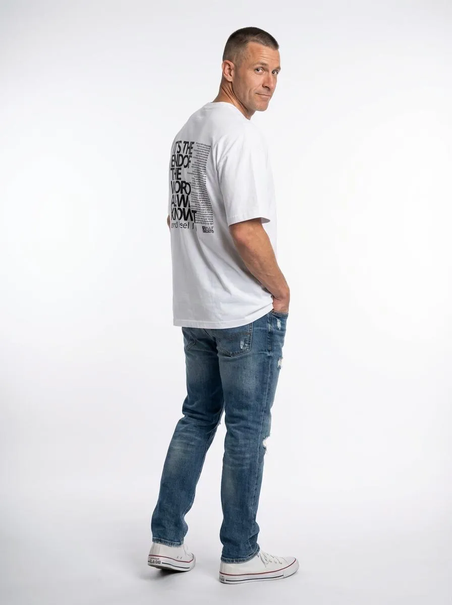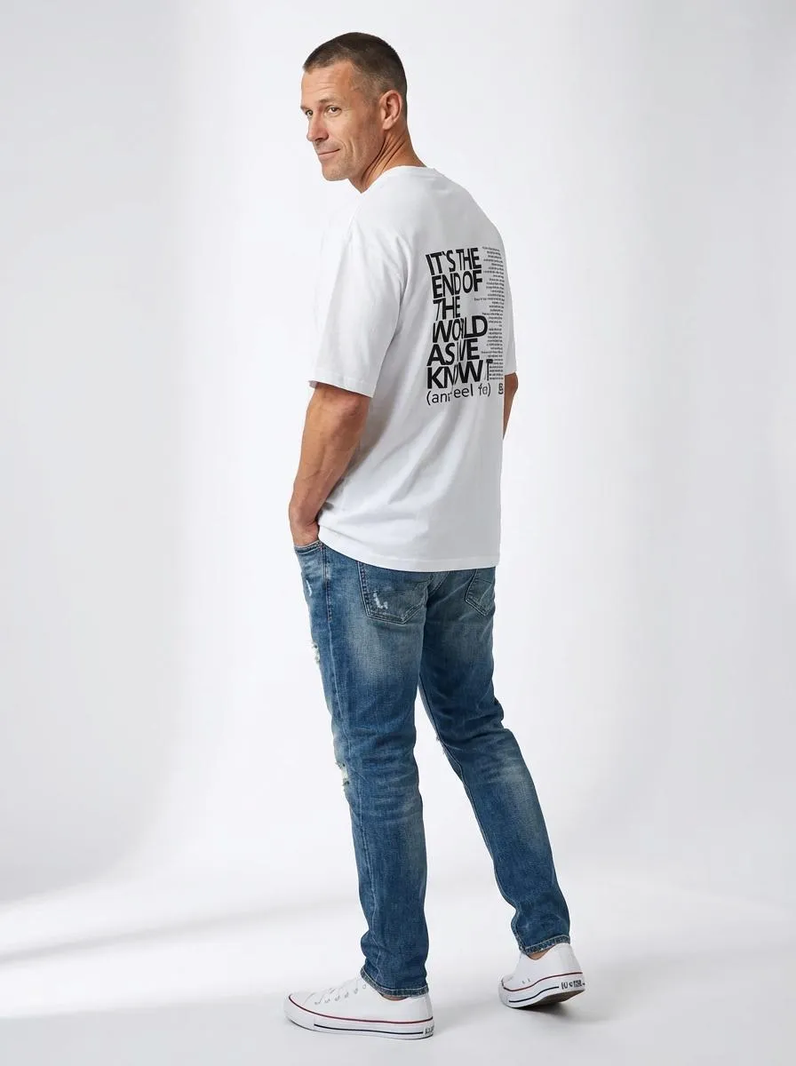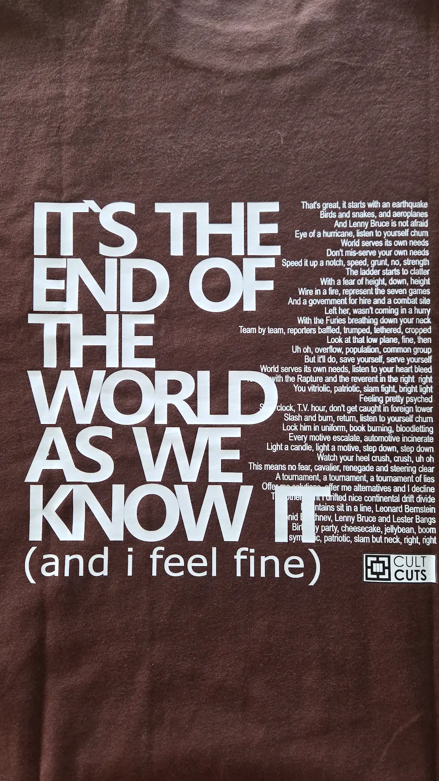 La TShirt End reinterpreta uno de los himnos más reconocibles del rock alternativo: It’s the End of the World as We Know It (And I Feel Fine), de R.E.M. (1987). El diseño estampa la frase principal en tipografía contundente, mientras la letra completa aparece como un bloque de caos textual al costado, evocando la intensidad verbal y el espíritu irónico de la canción. Algodón premium, corte clásico y un guiño a quienes saben que, aunque todo se derrumbe, todavía se puede cantar.